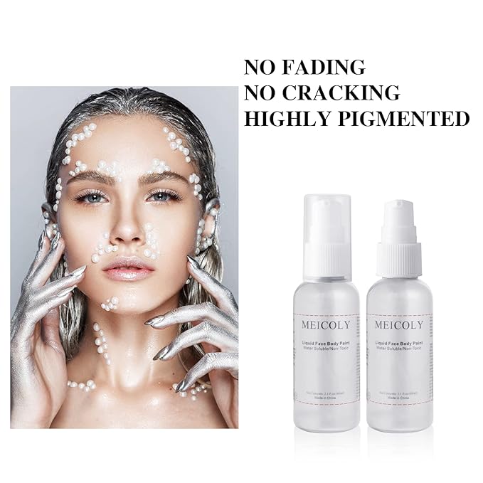 MEICOLY Metallic Silver Face Body Paint,2.1Oz Smudge-proof Silver Face Paint for Halloween Tin Man SFX Cosplay Makeup,Water Based Washable Full Body Paint for Adults and Kids