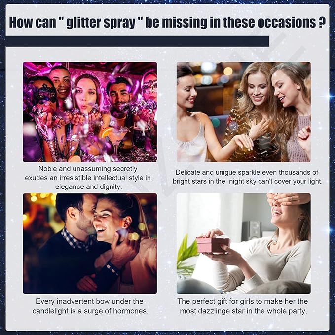 - 【UNIQUE DESIGN】-- Shake it gently for seconds before use for better mist results, then keep a distance of 30-50 cm to spray on your hair, body or clothing, these glitter powder will quickly absorb on the surfaces. NOTICE: DO NOT SPRAY ON YOUR EYES, NOSE AND MOUTH.