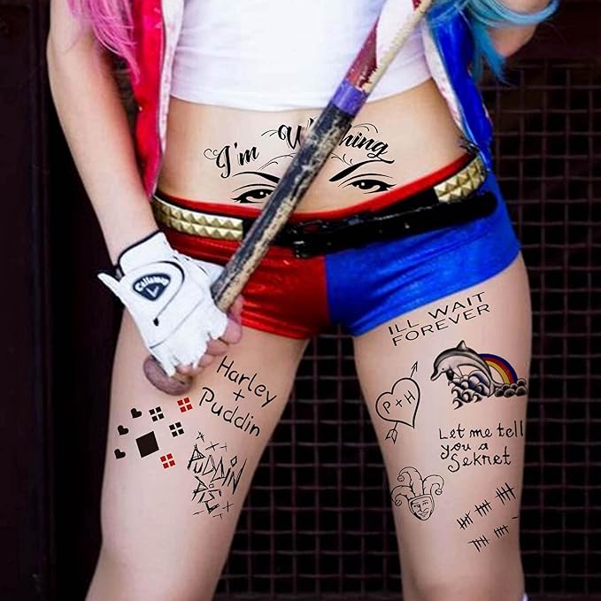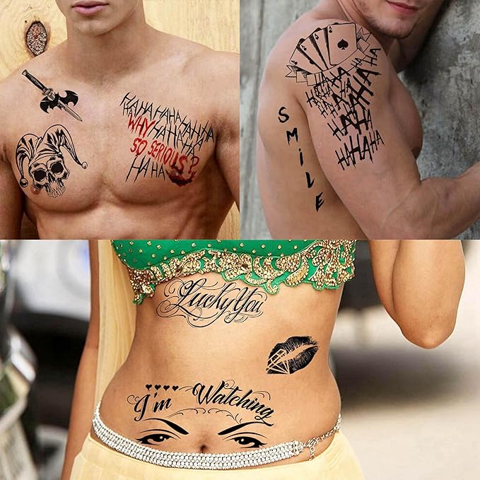 - 🌊【6 Sheets Creative 3D Joker Temporary Tattoo Stickers】JOEHAPY Unique Design 3D Halloween Tattoos Clown Joker Tattoos Halloween Costume Accessories. 【Size】6 Sheets Large Fake Tattoos For Women 8.2"x5.9" Prison Prisoner Gothic Inmate Rapper Fake Tattoos That Look Real And Last Long.